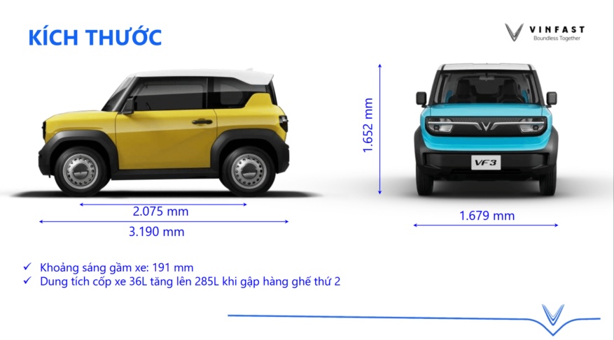 VinFast VF 3 2026: Chi tiết Giá Bán, Thông Số, Ưu Đãi Mới Nhất tại Đà Nẵng Ngày đăng 27/03/2026 1. Tổng quan về VinFast VF 3 2026 VinFast VF 3 2026 là mẫu xe điện mini mới của VinFast, đang nhận được nhiều sự quan tâm từ người dùng Việt Nam, đặc biệt là khách hàng trẻ yêu thích phong cách năng động, tiện lợi và tiết kiệm. Với thiết kế nhỏ gọn, cá tính, khả năng vận hành linh hoạt trong đô thị cùng mức giá dễ tiếp cận, VF 3 được xem là một trong những lựa chọn đáng chú ý trong phân khúc xe điện cỡ nhỏ. Tại Đà Nẵng, xu hướng sử dụng xe điện ngày càng phổ biến nhờ ưu điểm thân thiện với môi trường, chi phí vận hành thấp và phù hợp với điều kiện di chuyển trong thành phố. Nếu bạn đang tìm kiếm một mẫu ô tô điện phục vụ nhu cầu đi lại hằng ngày, VinFast VF 3 là cái tên rất đáng cân nhắc. 2. Thiết kế và ngoại thất VinFast VF 3 2026 2.1. Kích thước tổng thể VinFast VF 3 sở hữu kích thước nhỏ gọn, rất phù hợp để di chuyển trên những tuyến phố đông đúc hoặc các khu dân cư có không gian hẹp. Thông số kích thước cụ thể như sau: Dài x Rộng x Cao: 3.190 x 1.679 x 1.652 mm Khoảng sáng gầm xe: 191 mm Bán kính quay vòng nhỏ, giúp xe dễ dàng xoay trở trong phố Với lợi thế này, VF 3 đặc biệt phù hợp cho nhu cầu đi lại hằng ngày tại đô thị như Đà Nẵng. 2.2. Điểm nổi bật trong thiết kế VinFast VF 3 mang phong cách SUV cỡ nhỏ với ngoại hình vuông vức, trẻ trung và khỏe khoắn. Dù có kích thước nhỏ, mẫu xe vẫn tạo được ấn tượng mạnh nhờ thiết kế hiện đại và cá tính. Một số điểm nhấn đáng chú ý gồm: Cụm đèn trước và sau thiết kế sắc sảo, tăng khả năng nhận diện Lưới tản nhiệt dạng kín, giúp tối ưu tính khí động học Bộ mâm hợp kim 16 inch tạo cảm giác chắc chắn và thể thao Tổng thể thiết kế của VF 3 hướng đến nhóm khách hàng trẻ, yêu thích sự khác biệt và năng động. 3. Nội thất và tiện nghi bên trong 3.1. Trang bị tiện nghi Không gian nội thất của VinFast VF 3 được thiết kế theo phong cách tối giản nhưng vẫn đáp ứng tốt nhu cầu sử dụng cơ bản. Xe được trang bị nhiều tiện ích đáng chú ý như: Màn hình giải trí cảm ứng 10 inch Cổng USB loại A cho hàng ghế sau: 1 cổng 1.5A Cổng USB loại C cho hàng ghế trước Kết nối Wi-Fi phục vụ cập nhật phần mềm từ xa Kết nối Bluetooth Hệ thống âm thanh 2 loa Hộc đựng cốc ở giữa hàng ghế trước Phanh tay điện tử Điều hòa chỉnh cơ 1 vùng Lọc không khí cabin với chức năng lọc bụi Chức năng làm tan sương, tan băng Nhìn chung, dù là mẫu xe điện đô thị giá dễ tiếp cận, VF 3 vẫn được trang bị đầy đủ những tiện nghi cần thiết để mang lại trải nghiệm sử dụng thuận tiện. 3.2. Ghế ngồi và khoang hành lý VinFast VF 3 có cấu hình 4 chỗ ngồi, phù hợp với cá nhân, cặp đôi hoặc gia đình nhỏ. Các trang bị ghế ngồi gồm: Ghế lái bọc nỉ, chỉnh cơ 4 hướng, tích hợp tựa đầu Ghế phụ bọc nỉ, chỉnh cơ 4 hướng, tích hợp tựa đầu Hàng ghế thứ hai có thể gập hoàn toàn để tăng không gian chứa đồ Thiết kế nội thất tối ưu giúp xe vừa đảm bảo sự gọn gàng, vừa đáp ứng nhu cầu chở người và hành lý linh hoạt. 4. Động cơ và khả năng vận hành 4.1. Công nghệ pin và thời gian sạc VinFast VF 3 sử dụng pin LFP với dung lượng khả dụng 18,64 kWh, cho khả năng vận hành phù hợp với nhu cầu đi lại trong đô thị. Các thông số nổi bật gồm: Loại pin: LFP Dung lượng pin khả dụng: 18,64 kWh Quãng đường đi được sau mỗi lần sạc đầy (theo NEDC): 215 km Thời gian sạc thường: 5 giờ (từ 10% đến 70%) Thời gian sạc nhanh: 36 phút (từ 10% đến 70%) Với phạm vi hoạt động này, VF 3 đáp ứng tốt nhu cầu di chuyển hằng ngày trong thành phố và các quãng đường ngắn lân cận. 4.2. Hệ thống truyền động và hiệu suất lái VinFast VF 3 được trang bị hệ truyền động phù hợp với một mẫu xe điện đô thị nhỏ gọn: Công suất tối đa: 30 kW (40 hp) Mô-men xoắn cực đại: 110 Nm Dẫn động: cầu sau (RWD) Tốc độ tối đa: 100 km/h khi pin trên 50% Hệ thống treo và vận hành: Treo trước: độc lập MacPherson Treo sau: phụ thuộc, trục cứng với thanh xoắn Panhard Kích thước lốp/lazang: 175/75R16 Trợ lực lái điện Nhờ thiết kế nhỏ gọn kết hợp trợ lực lái điện, VF 3 cho cảm giác lái linh hoạt, dễ điều khiển khi di chuyển trong phố. 5. Tính năng an toàn và an ninh 5.1. Hệ thống an toàn VinFast VF 3 được trang bị các tính năng an toàn cơ bản, đáp ứng nhu cầu sử dụng hàng ngày: Phanh trước đĩa, phanh sau tang trống Hệ thống chống bó cứng phanh ABS Chức năng kiểm soát lực kéo TCS Hỗ trợ khởi hành ngang dốc HAS Tự động khóa cửa khi xe di chuyển từ 5 km/h Đèn báo phanh khẩn cấp ESS 1 túi khí cho người lái Hỗ trợ đỗ xe phía sau 5.2. Hệ thống an ninh Bên cạnh các tính năng an toàn, VF 3 còn được trang bị: Tính năng khóa động cơ khi phát hiện trộm Đây là trang bị hữu ích giúp tăng tính bảo mật cho xe trong quá trình sử dụng. 6. Giá
